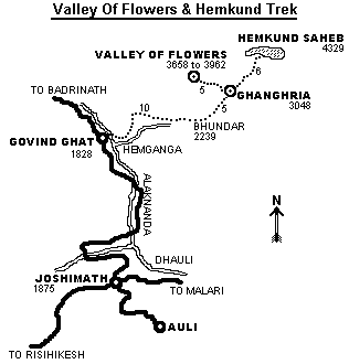 After crossing the Alaknanda river at Govindghat, an ascending bridle path along Bhyundar Ganga leads to Ghangharia which is 13 kms. Away from Govindghat, from wher the Valley is only 3 kms.